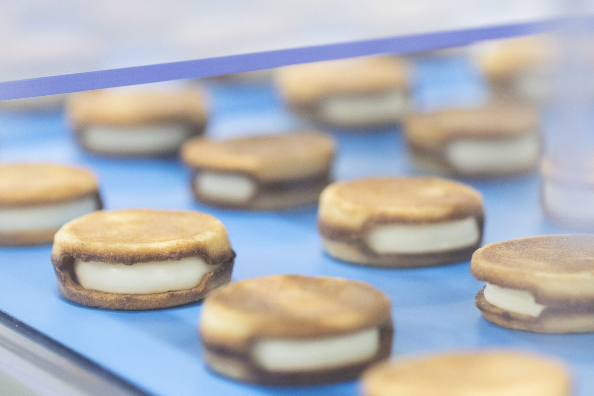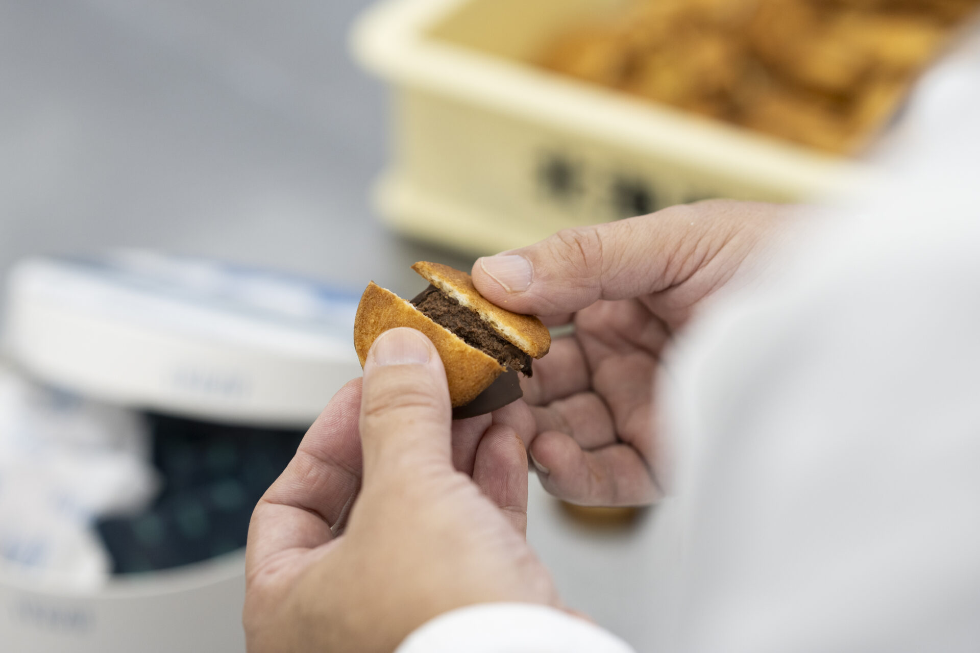 スノーサンドのおいしさは、カリカリのラングドシャと、とろける生チョコのコントラストにあります。熱した鉄板で挟み焼きにすることで水分が一気に飛び、独特の食感が生み出されるラングドシャ。焼き加減を攻めることで、香ばしさとカリッと感を最大限に引き出しています。ラングドシャの内側に入っている十字の切込みもポイント。これがラングドシャを食べやすくしている秘訣です。