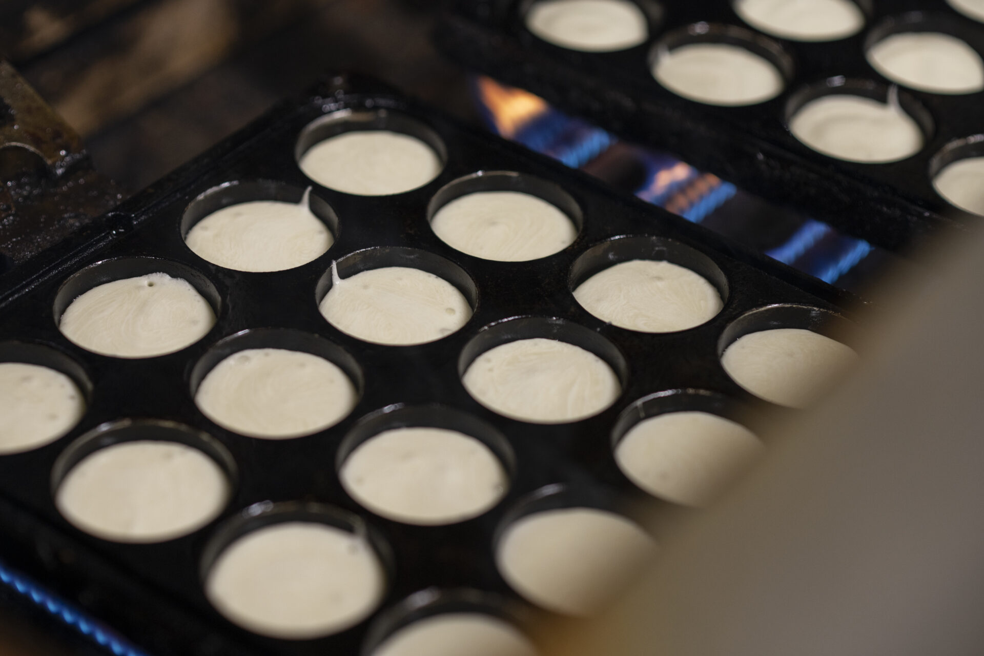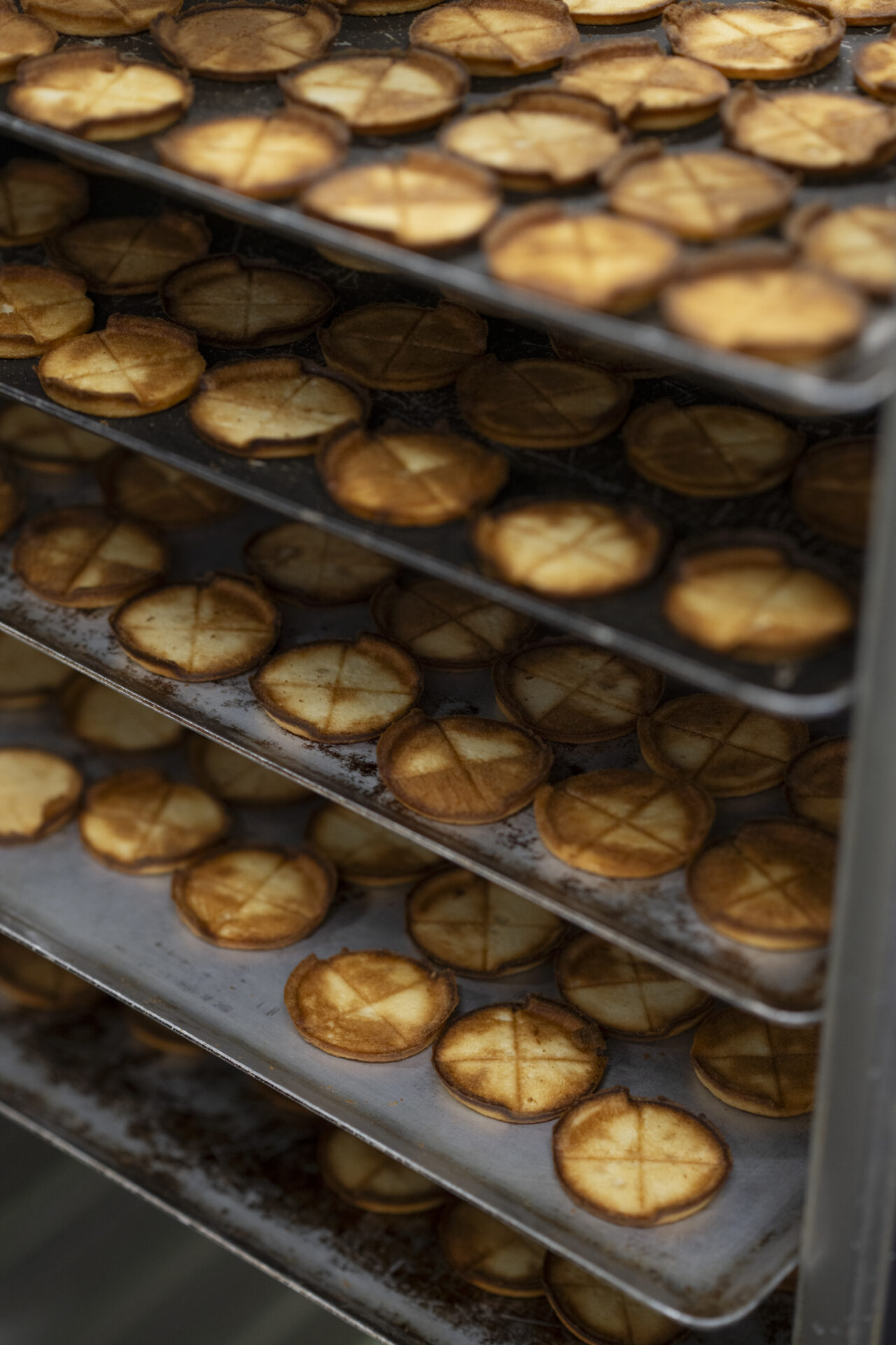 しかし、冬を代表するお菓子をつくりたい、まだ誰もやっていないことに挑戦しようという長沼の強い思いに背中を押され、久松さんたちは開発をスタートします。ラングドシャクッキーの焼き型はどうするか、どんな形にしたら焼けるか、考え続ける日々。「水蒸気で爆発したり、形が崩れたり。失敗の繰り返しでしたね。そこから少しずつ、理想に近づけていきました。これならと思うものができるまで、1年はかかったと思います。鉄板業者さんと焼き型の試作型を5〜6回はつくりましたね」。1個焼くのに15分近くかかるような手作業から始まり、ようやく今の形にたどり着いたといいます。