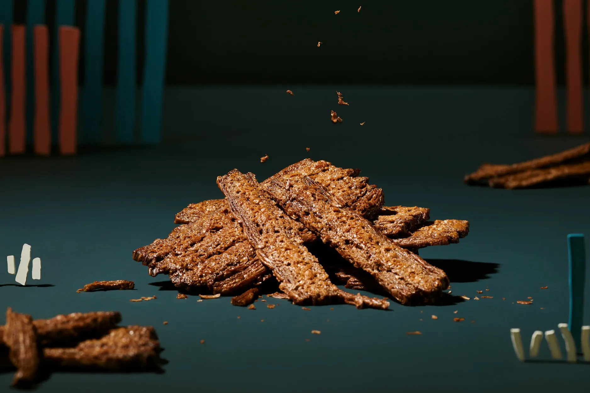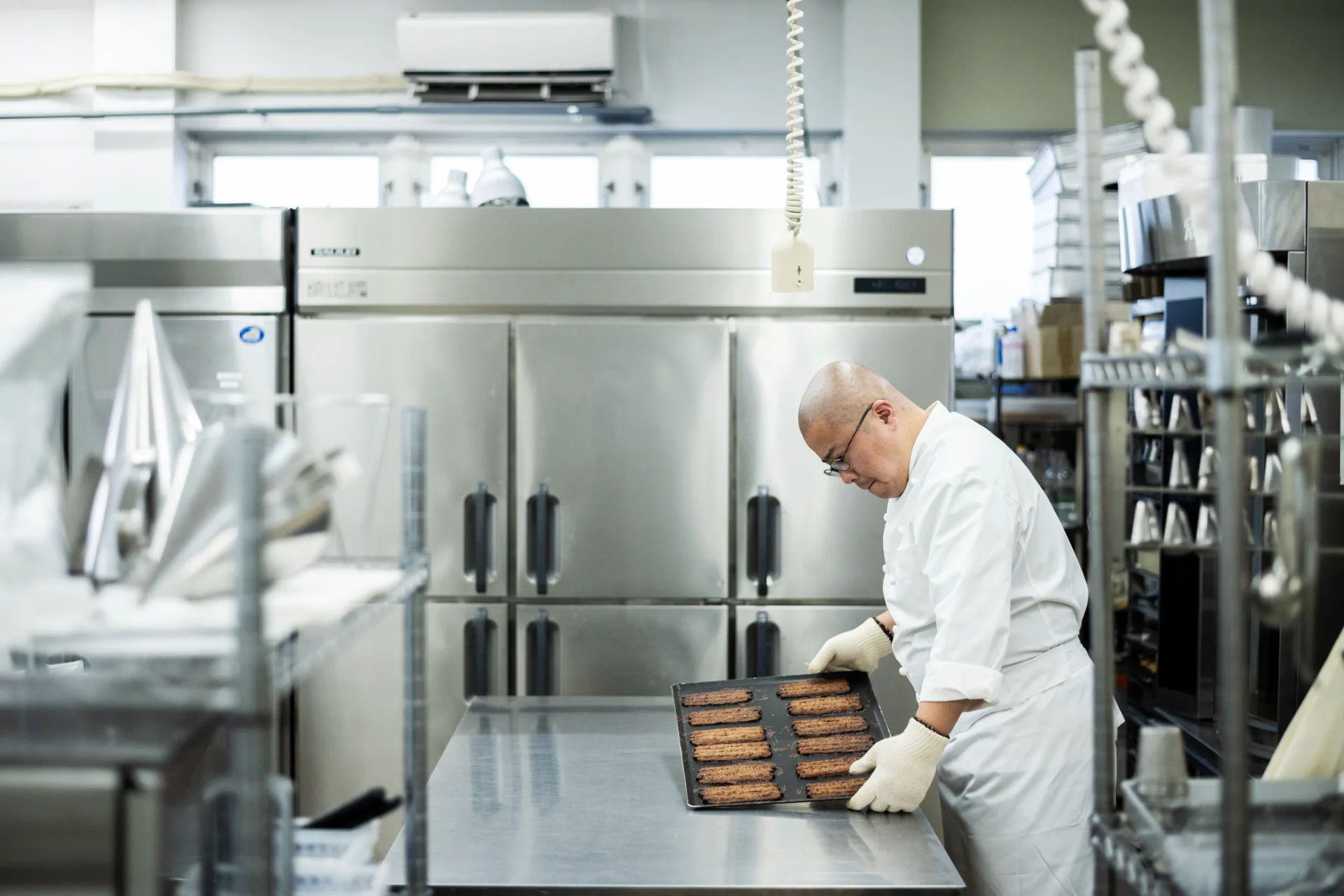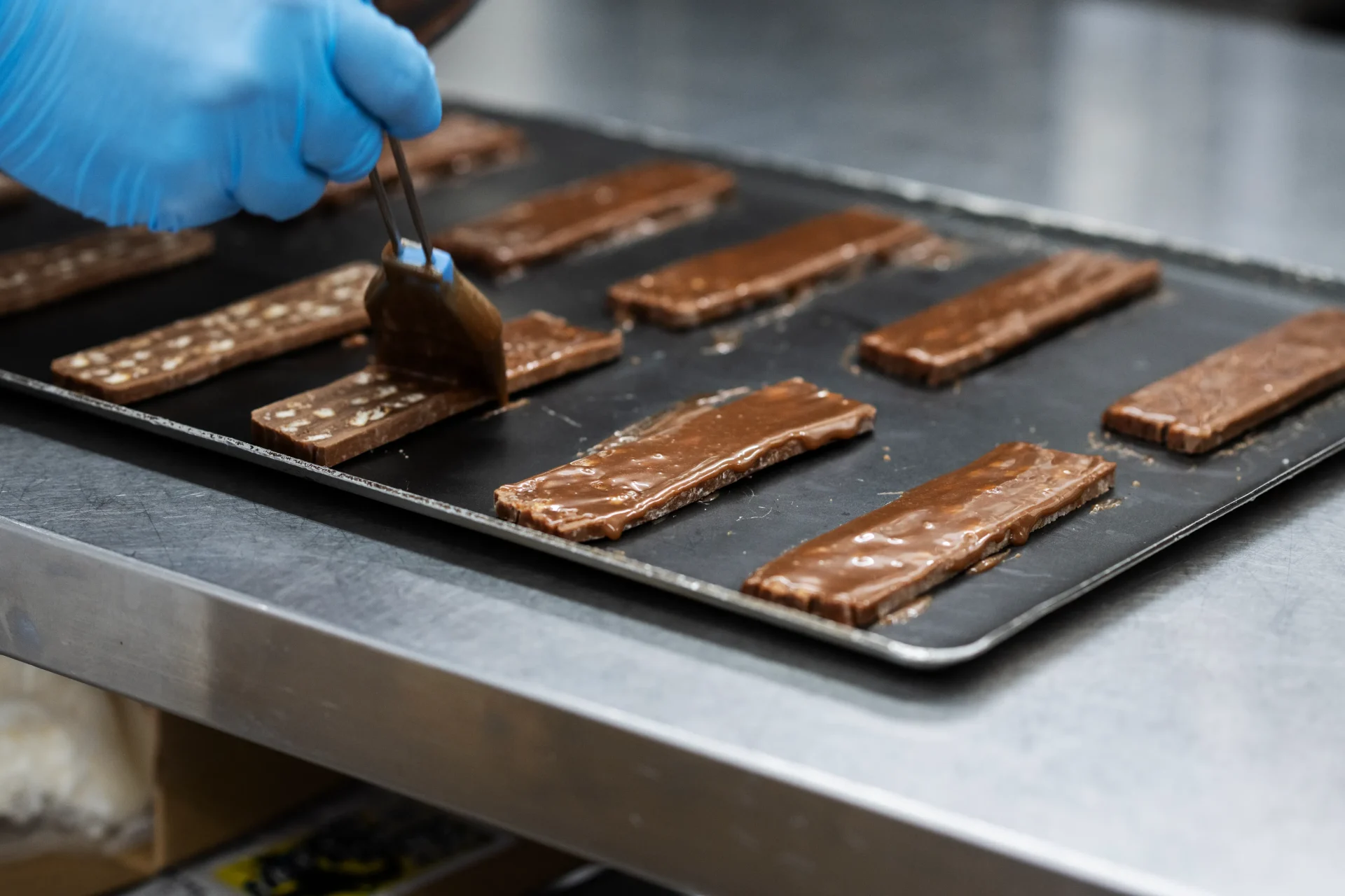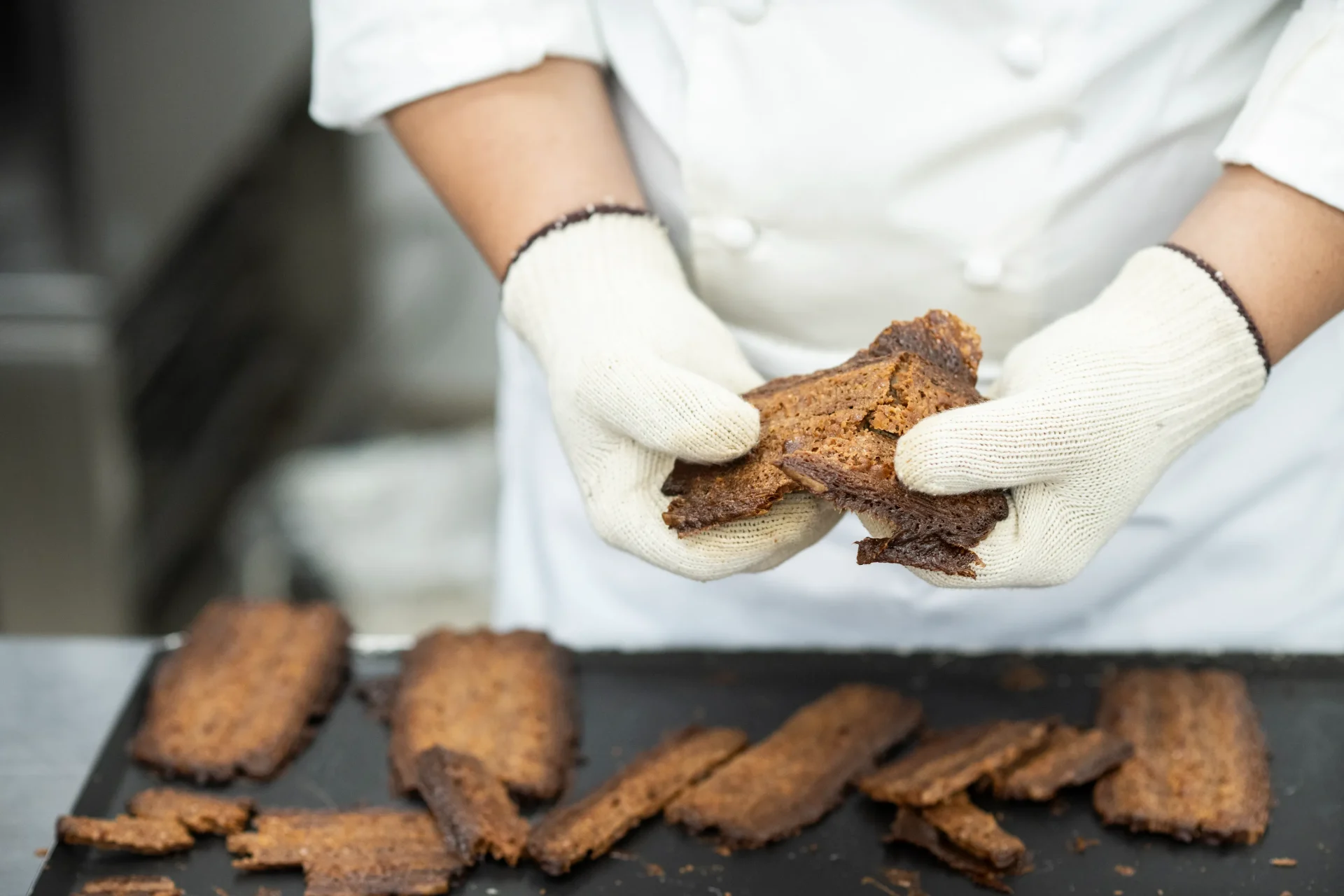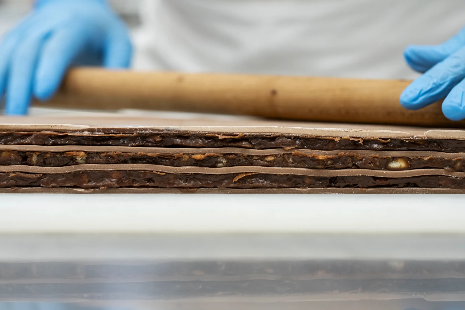 次第にSNOWSのブランドチーム、開発チーム双方で「パラパラと落ちる樹皮」というイメージが固まっていきます。「最終的に、パイ生地とクッキー生地を交互に重ねて層状にすることが決まりました。パイ生地は、伸びやすくなるよう一度折るごとに1~2時間休ませる必要があり、破れると美しい層にならない。かなり神経を使う工程でしたね。パイ生地をつくるだけで丸一日はかかったと思います。でも、ここまでは割とうまく進んだんです。この層状の生地をいざ、切ろうとなったとき、従来使っている機械だとつぶれてしまう。樹の皮を表現するための切り方、ここに一番時間を費やしたかもしれません」。切る方法を見つけた後も、工程のほとんどが手作業なのは変わりありません。とんとんぱらぱらは、多くの時間と繊細な作業の繰り返しで誕生しました。