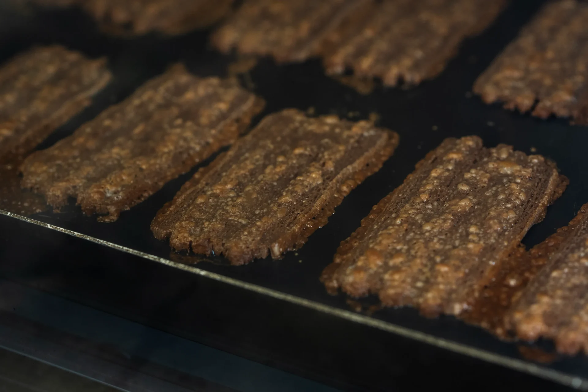 「チョコレートの味わいを、しっかり感じられるお菓子にしたかった」と、語る土橋さん。その言葉通り、クッキー生地にはチョコレートがたっぷりと練りこまれ、表面には惜しみなくチョコレートシロップが塗られています。「このシロップには、自社酪農場の放牧牛乳を使っています。焼いていくうちにだんだんシロップが煮詰まって、キャラメルのような香ばしい香りと甘み、そして味の深みが増していくんです」。