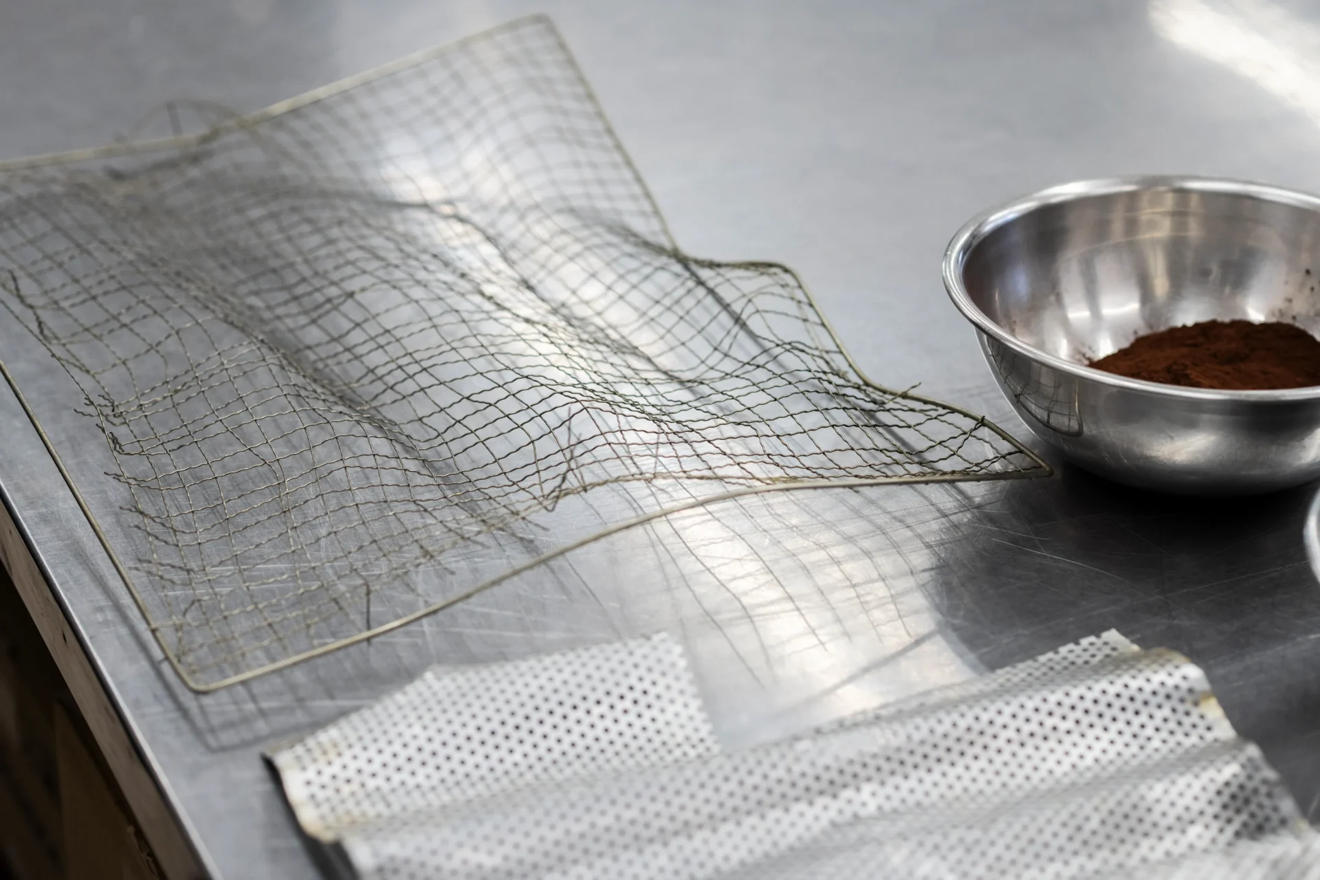 まず取り掛かったのは生地づくりです。「普通に焼くと平らになってしまうので、それではつまらない。そこでカーブを持つ薄い生地にしようと思ったんです。試行錯誤の末、曲がった網の上に生地を置いて焼く方法にたどり着きました」。