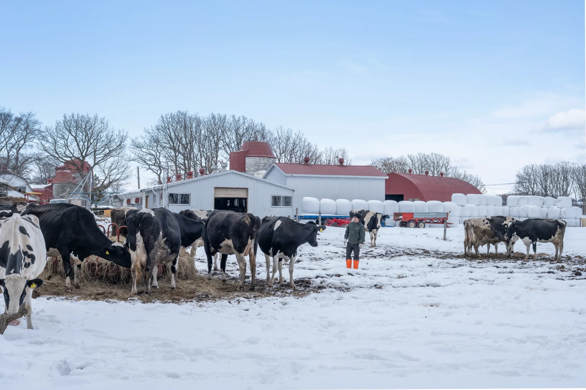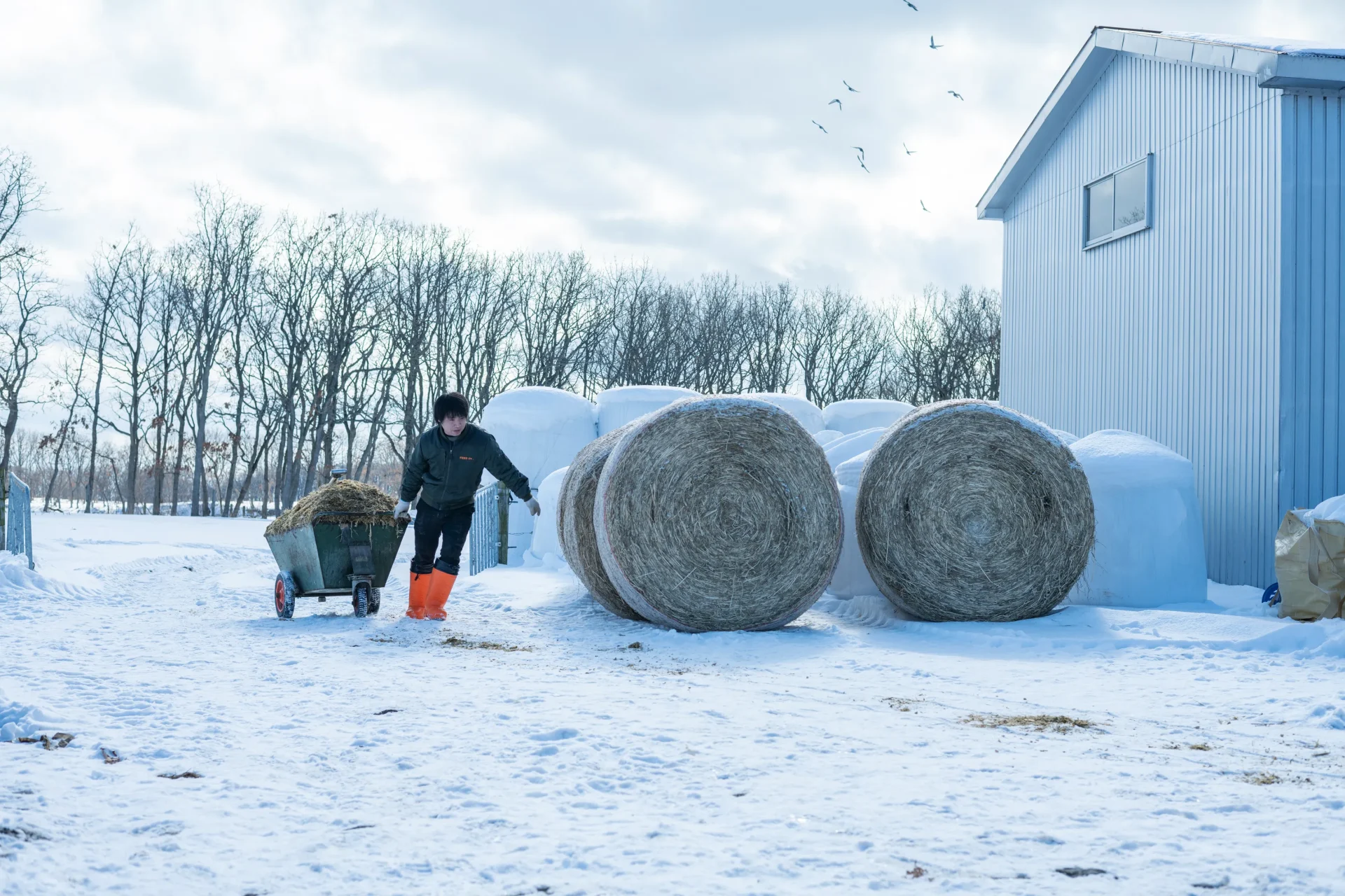 北海道・日高町の豊郷エリアは、冬は雪が少なくて晴れることが多い地域。しかし、今年は少し状況が違うようです。「去年は積雪が少なかったけれど、今年は割と多いですね」と話してくれたのは、以前もお話を聞かせてくれた牧場長の工藤さん。そんな中でも日高牧場では毎日、牛の放牧を続けています。「よほどの吹雪じゃない限り、9時から16時くらいまで放牧しています。一年を通じて生活リズムを変えないほうが、牛のストレスも少ないんです」。また、冬に放牧することは牛の体にもメリットがあるそう。「太陽の光を浴びることで、ビタミンの生成につながります。運動にもなるので代謝が良くなる上、お産も楽になるし、産後の牛乳の出も良くなります」。