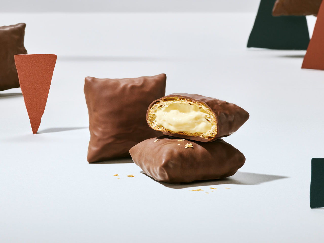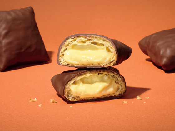 まくらのようなふっくらとしたパイに、まろやかなカスタードクリーム、ビターミルクチョコレートをまとわせ贅沢に仕上げました。